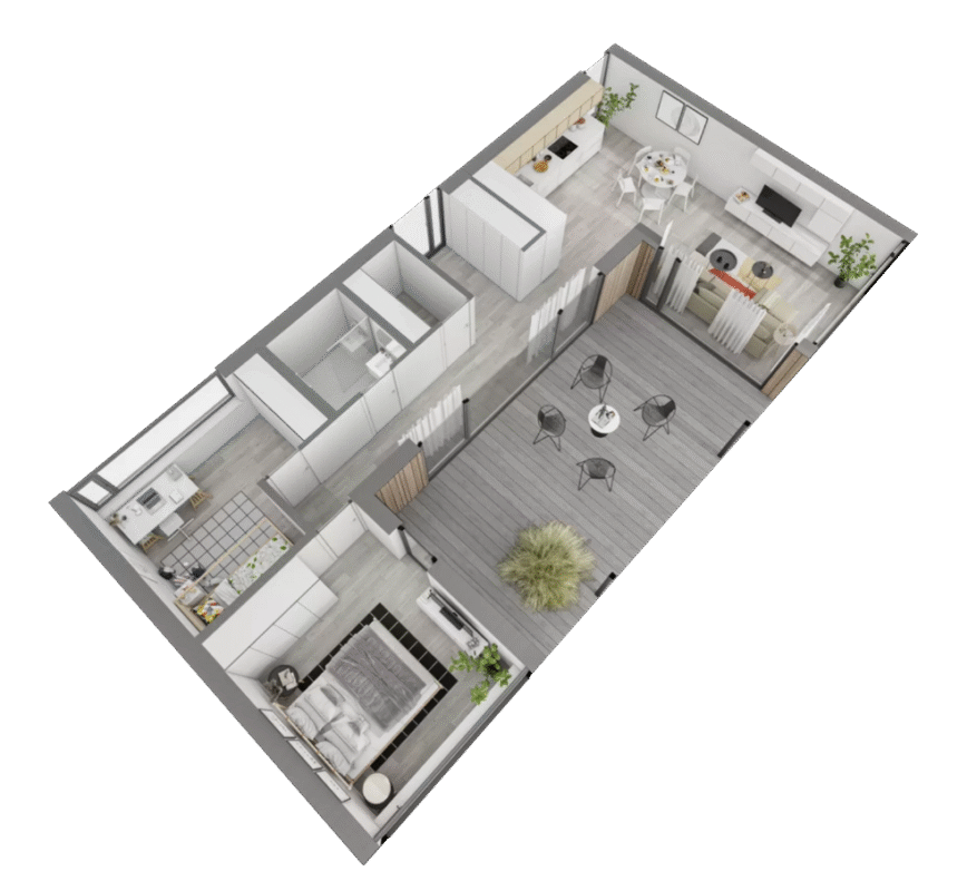 The Standard-E is 101m² LYFIO modular house, which consists of 4 modules. The house has three bedrooms, two bathrooms, a utility room and a living room with a dining room. This house project is a great choice for a family of 3-4 people. Everyone will have their own place to rest, and you can spend warm summer evenings on the spacious terrace of the house. Every modular house designed by us meets the requirements of the A++ energy class, so you can be calm about the low costs of the house.